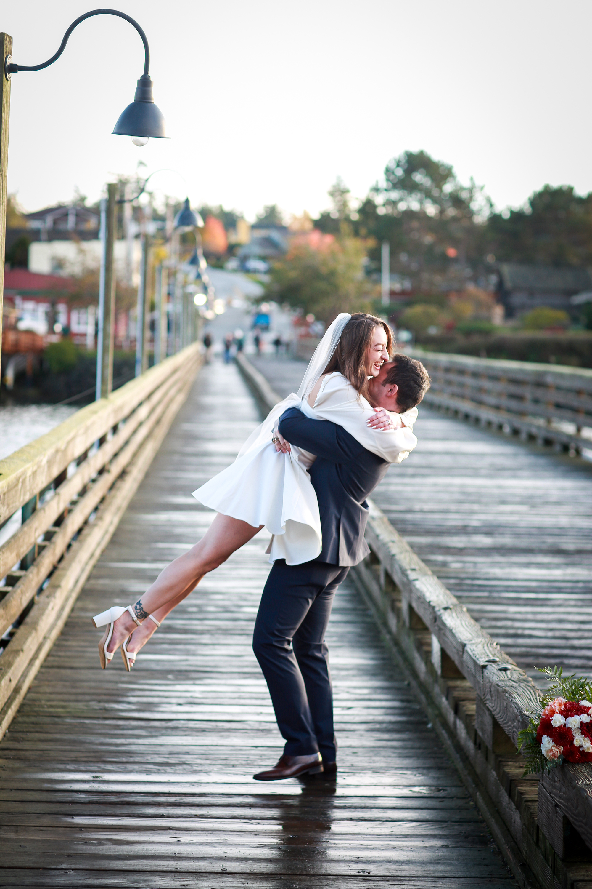 When everything was said and done I asked to take photos of a few more groupings outside. Then I asked the bride and groom to do some fun stuff as we left the venue and walked the long walk off the wharf. First we had her stand on a ledge and have the groom pick her up and spin her. She was clearly nervous but he had her and the shot is so fun and romantic. Its got to be one of my all time favorites. My other favorite is one where shes walking ahead of me with her husband and she turns back to smile. I am forever thankful for a bride who is aware of me and thinks to smile for the camera.